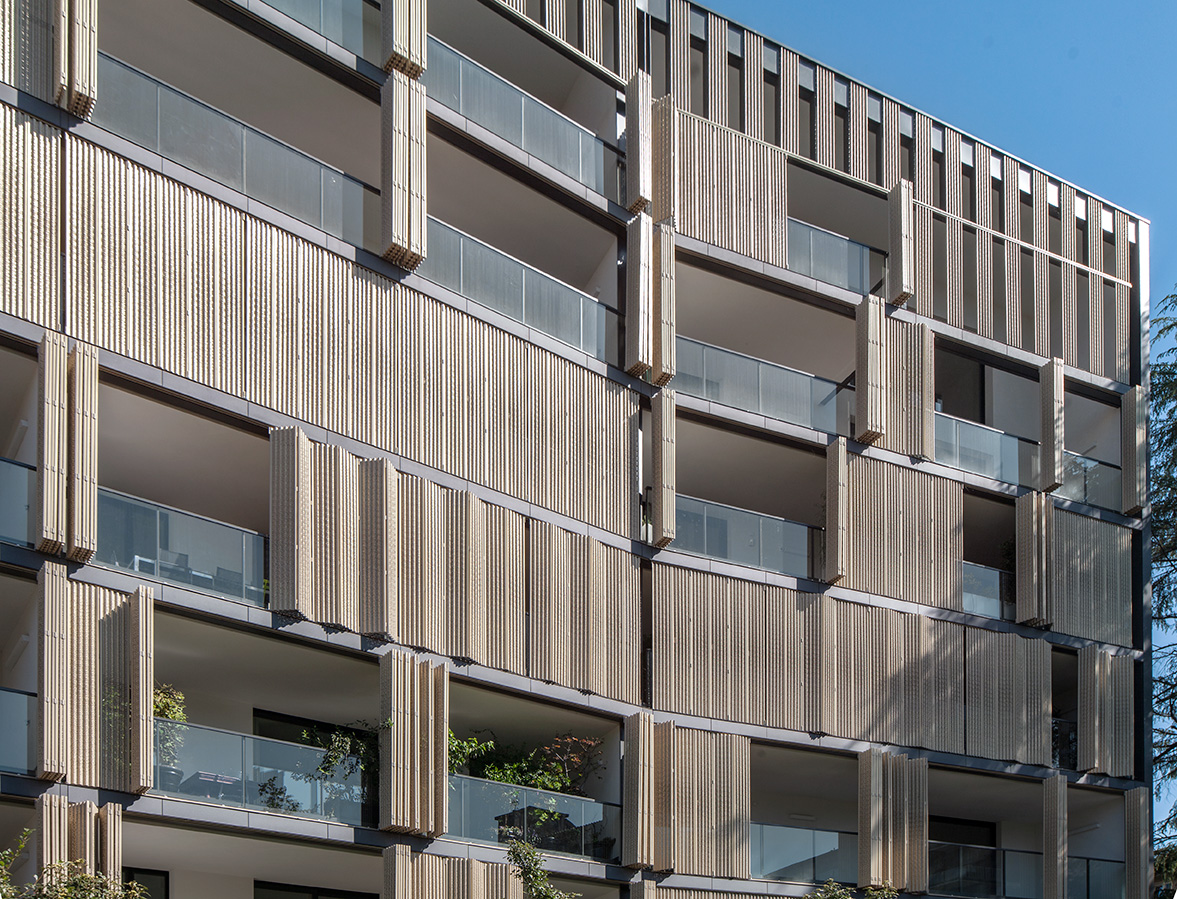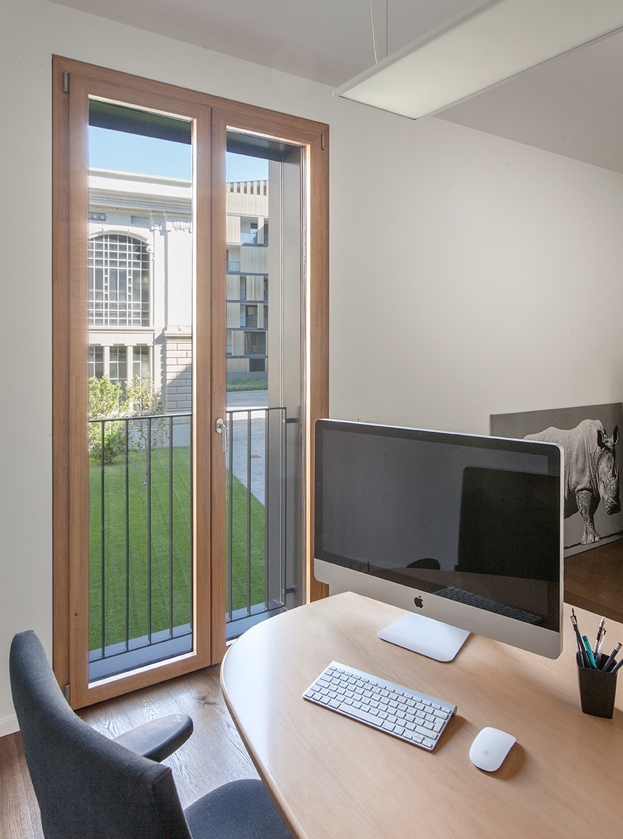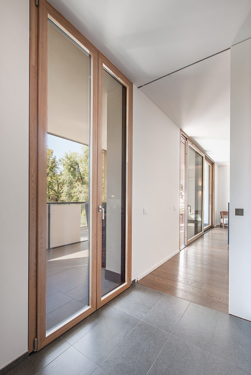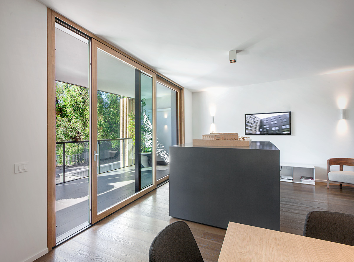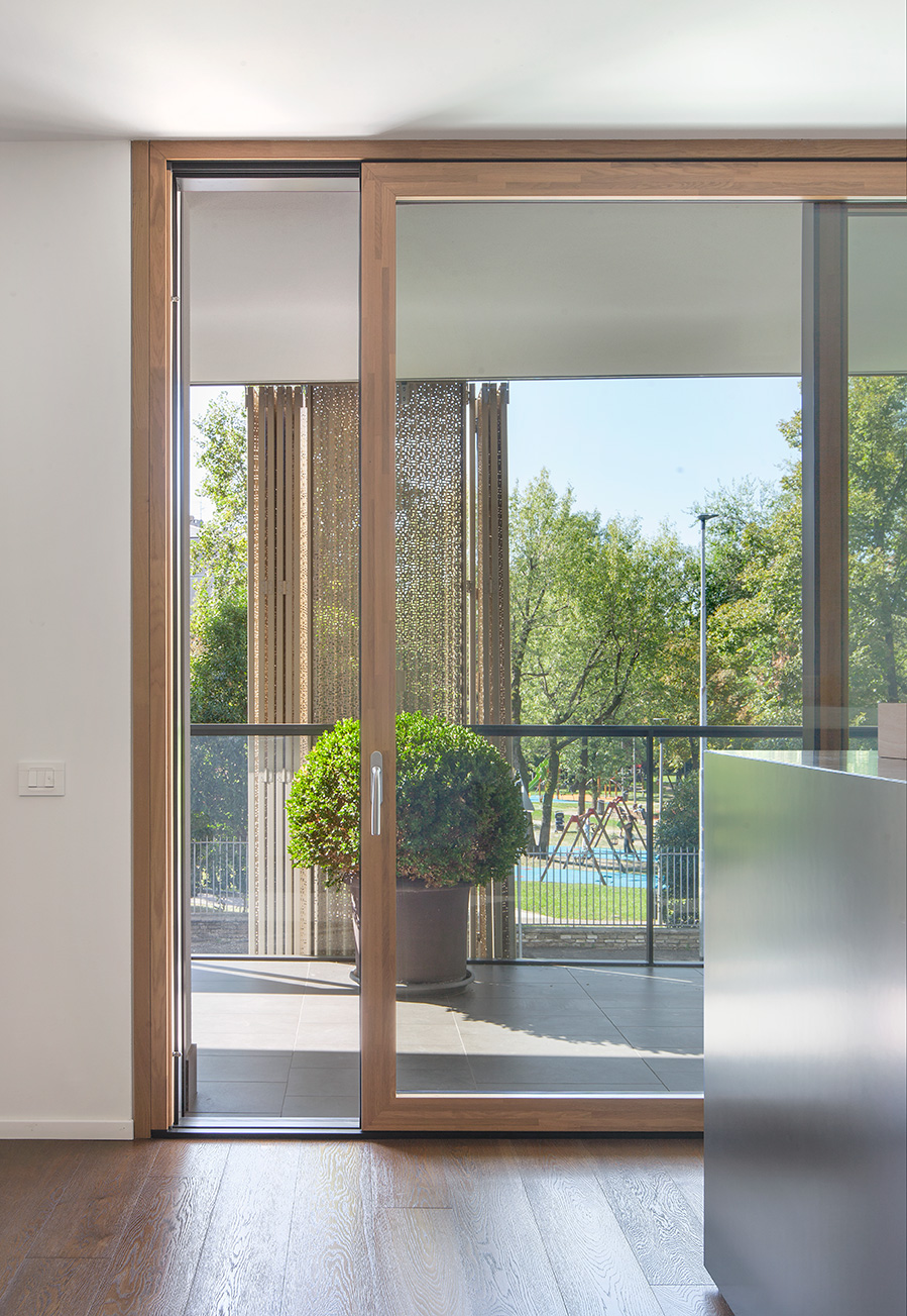 La scelta del legno-alluminio risponde alle esigenze di un progetto di alta qualità architettonica: calore e naturalezza negli interni, massima resistenza e durabilità all’esterno. Le grandi vetrate valorizzano la luminosità degli appartamenti e il rapporto con il verde condominiale, offrendo eccellenti prestazioni di isolamento termico e acustico in un contesto urbano.