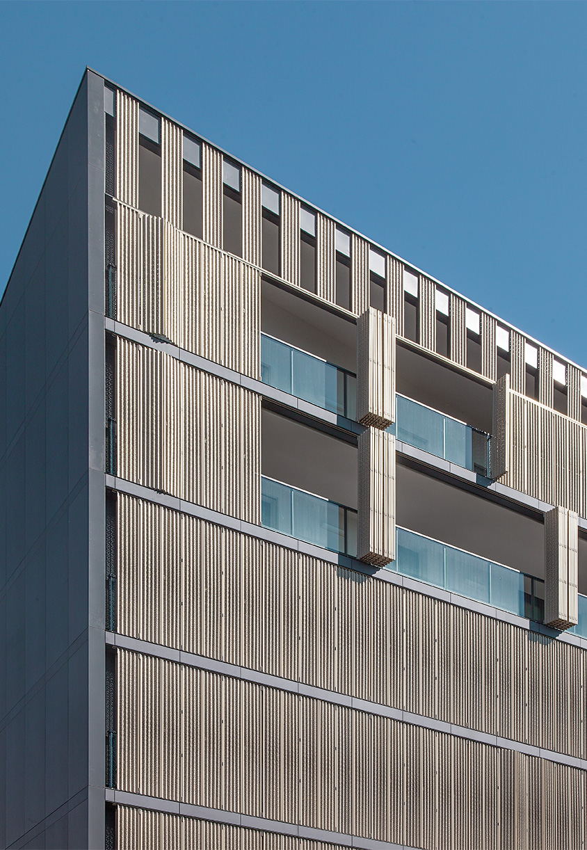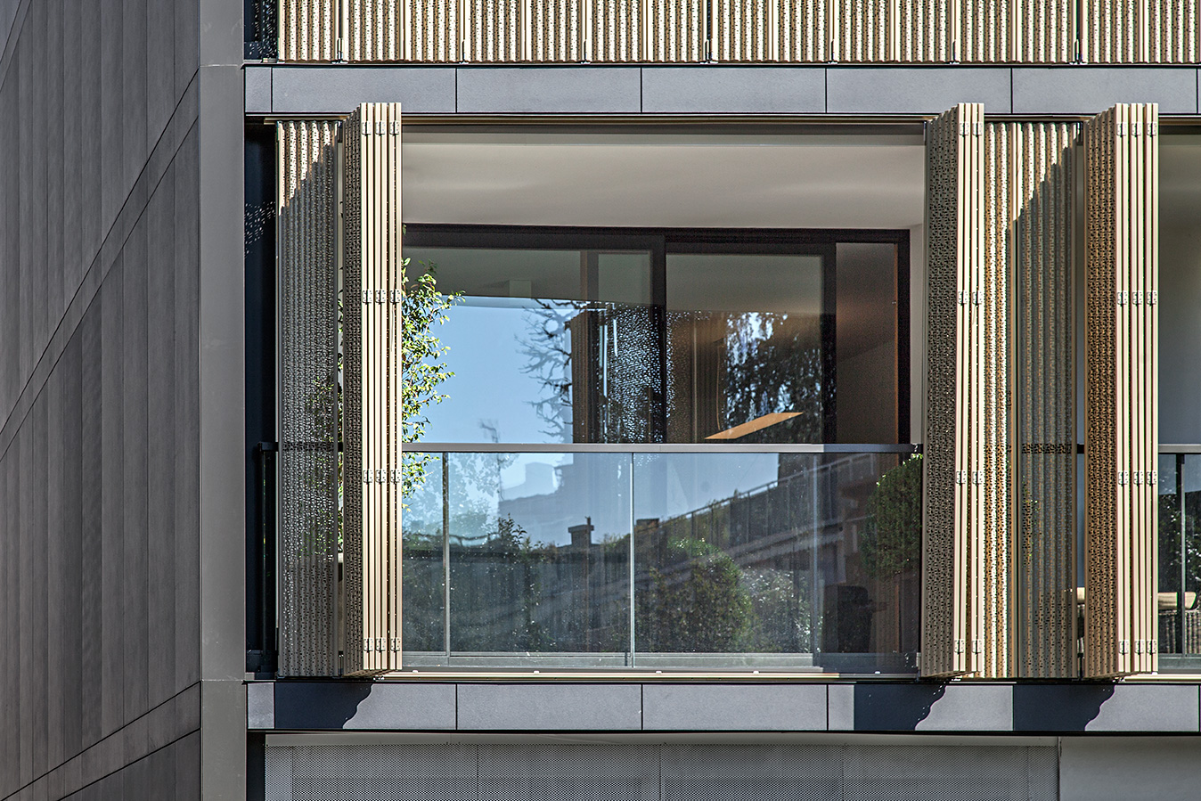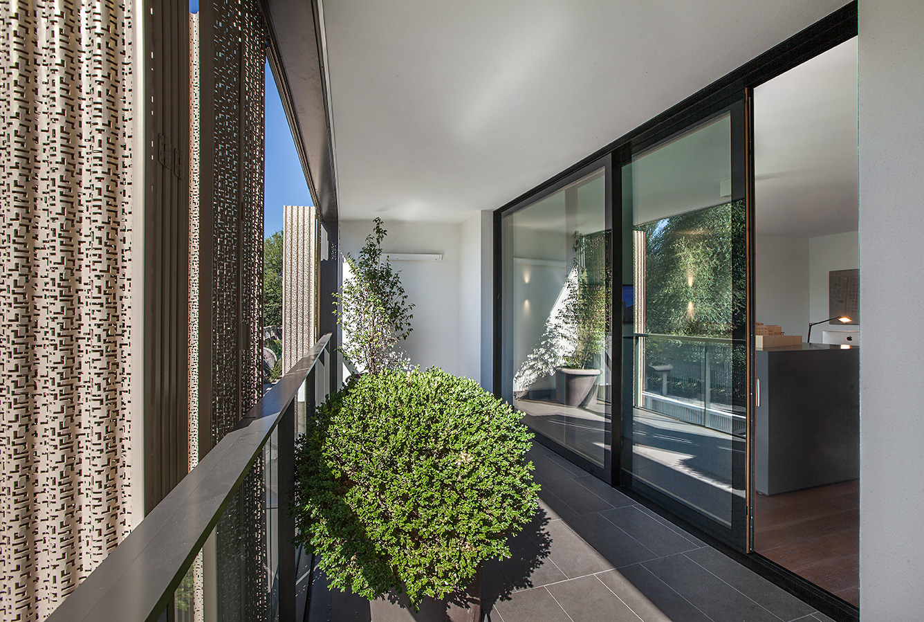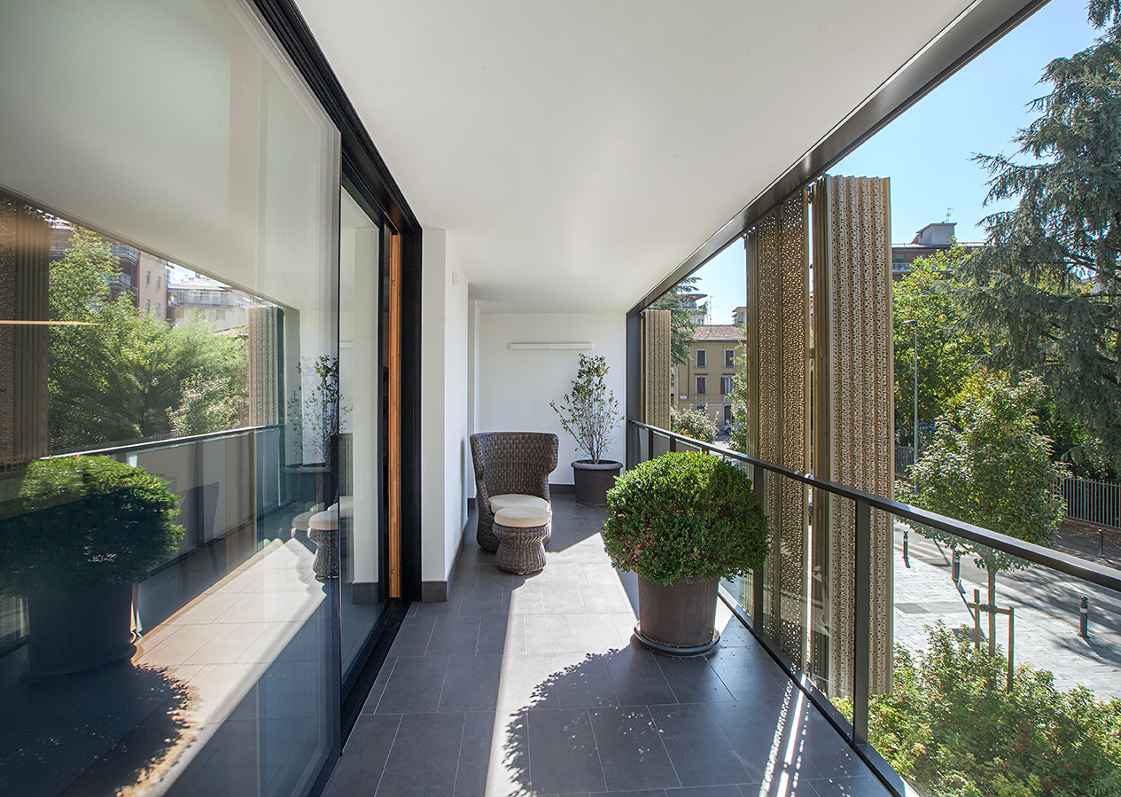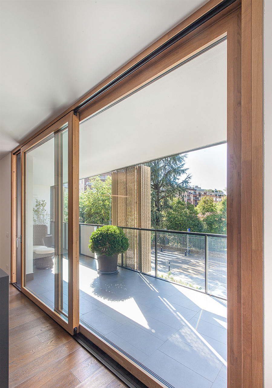 L’intervento ha previsto la realizzazione di serramenti su misura con interno in legno di rovere naturale e profilo esterno in alluminio, perfettamente integrati con le facciate rivestite da eleganti sistemi frangisole in lamelle verticali. Le ampie porte-finestre scorrevoli collegano gli spazi abitativi alle logge private, schermate da pannelli decorativi traforati che garantiscono privacy e controllo della luce.
