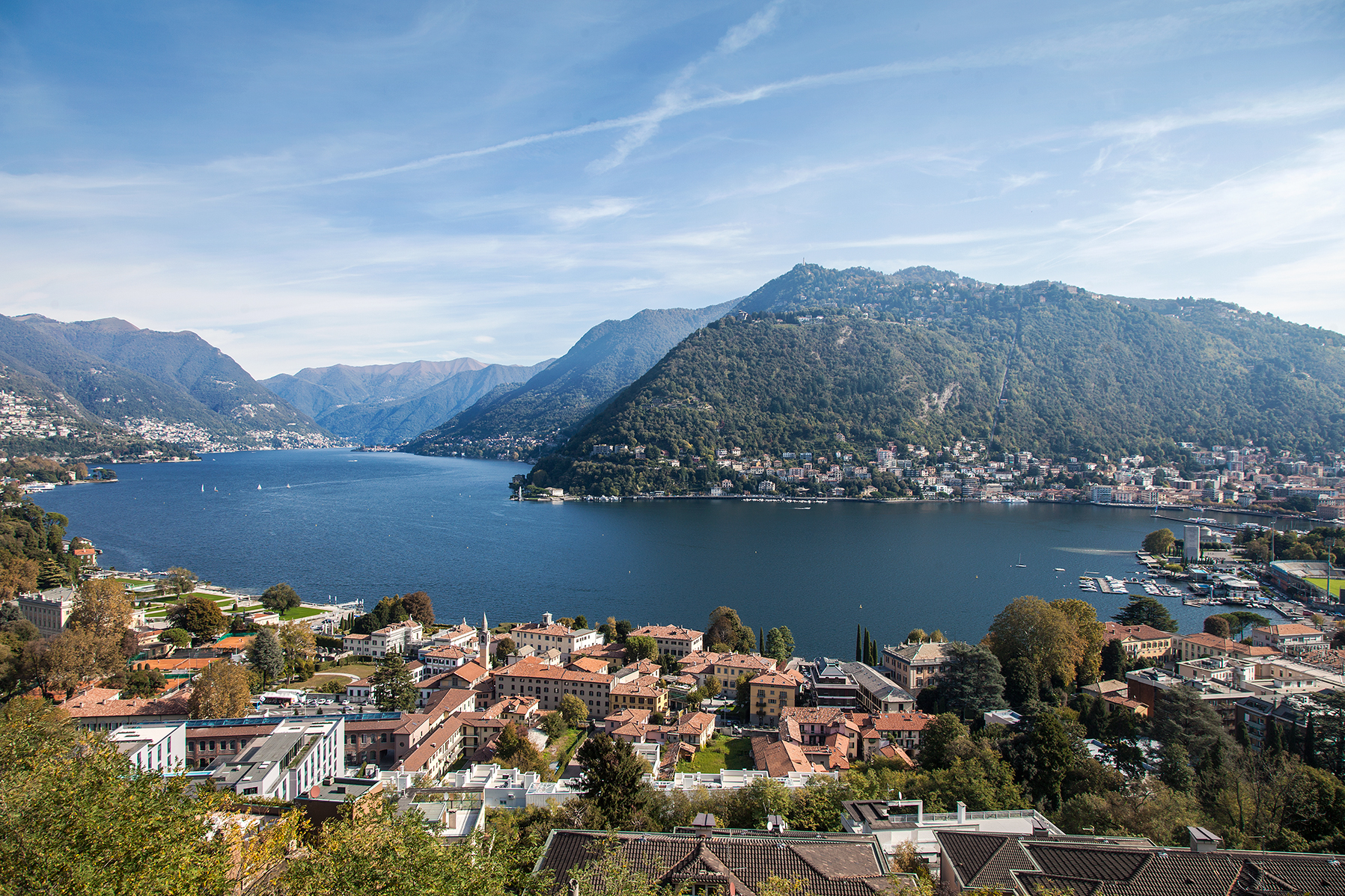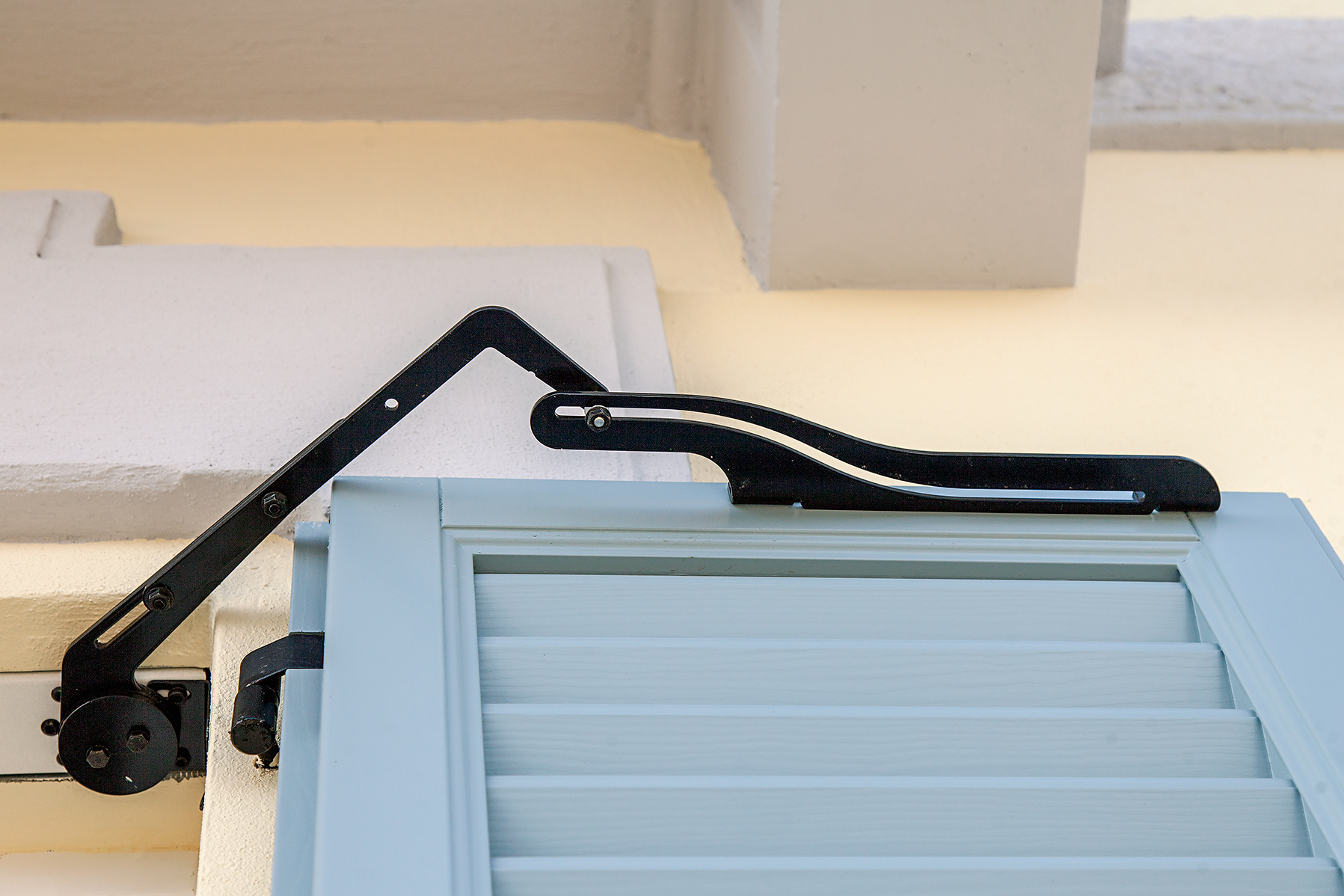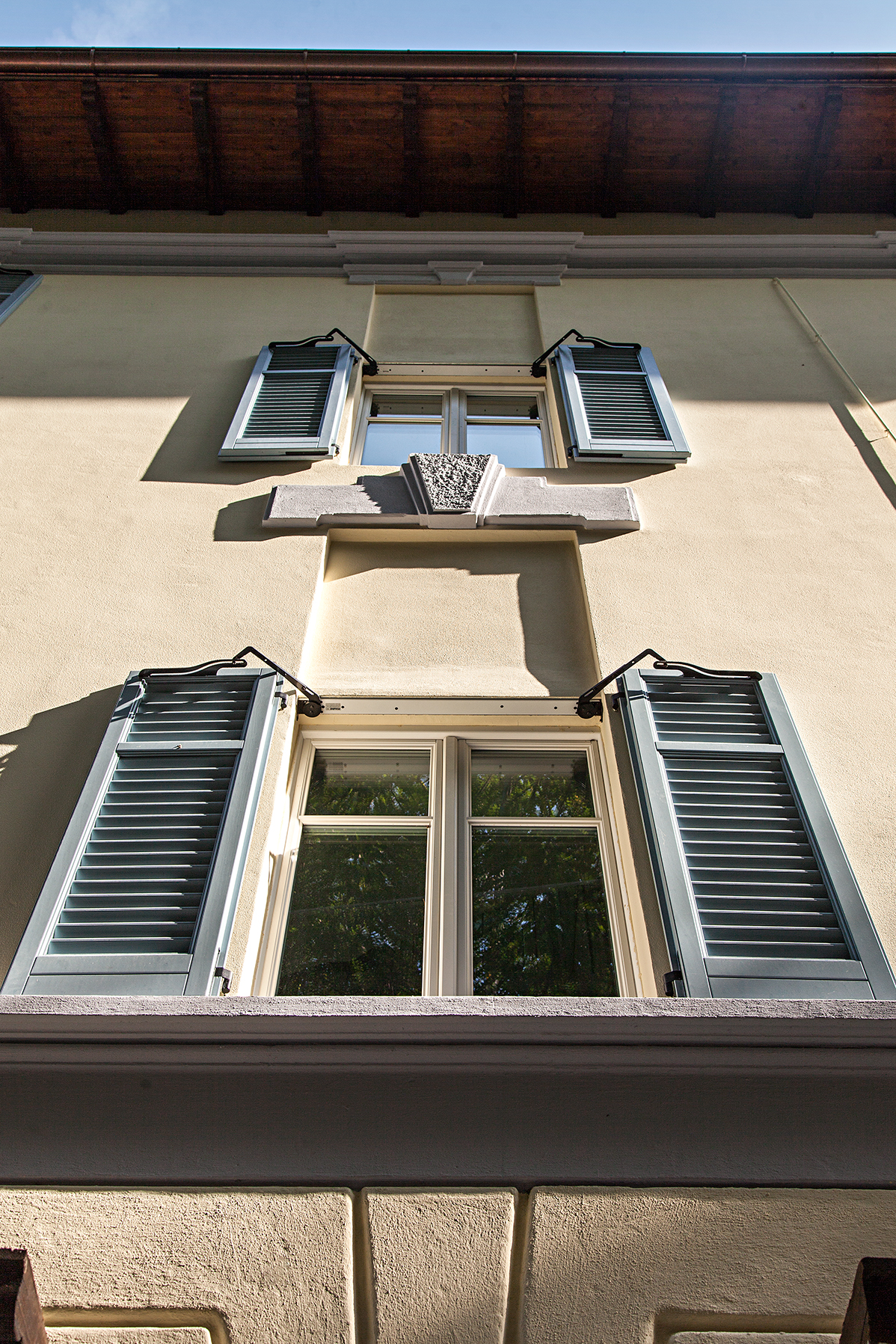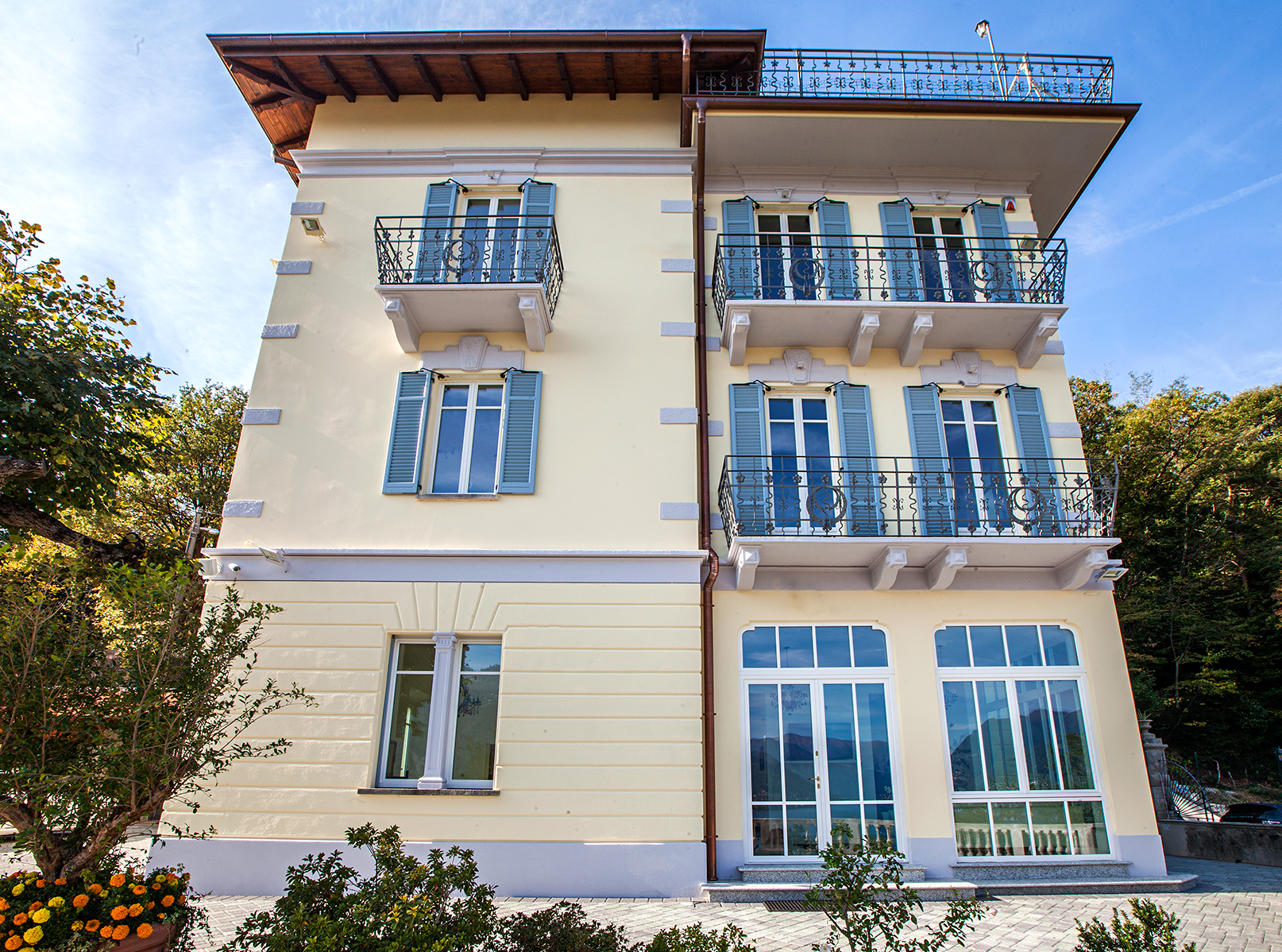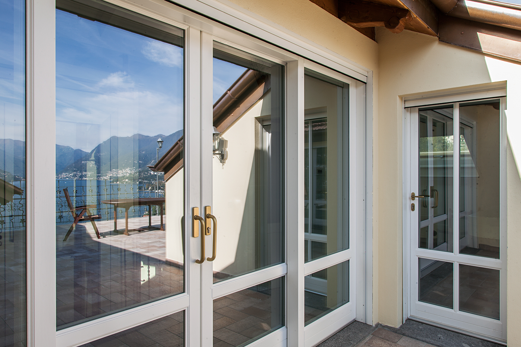 Le persiane in alluminio color azzurro, tipiche della tradizione lariana, sono state realizzate su misura con ferramenta in ferro battuto nero, preservando l’estetica storica della facciata. Particolare attenzione è stata dedicata ai dettagli: maniglie in ottone satinato, pannelli inferiori nelle porte-finestre delle camere, sopraluce fissi per massimizzare l’ingresso di luce naturale.