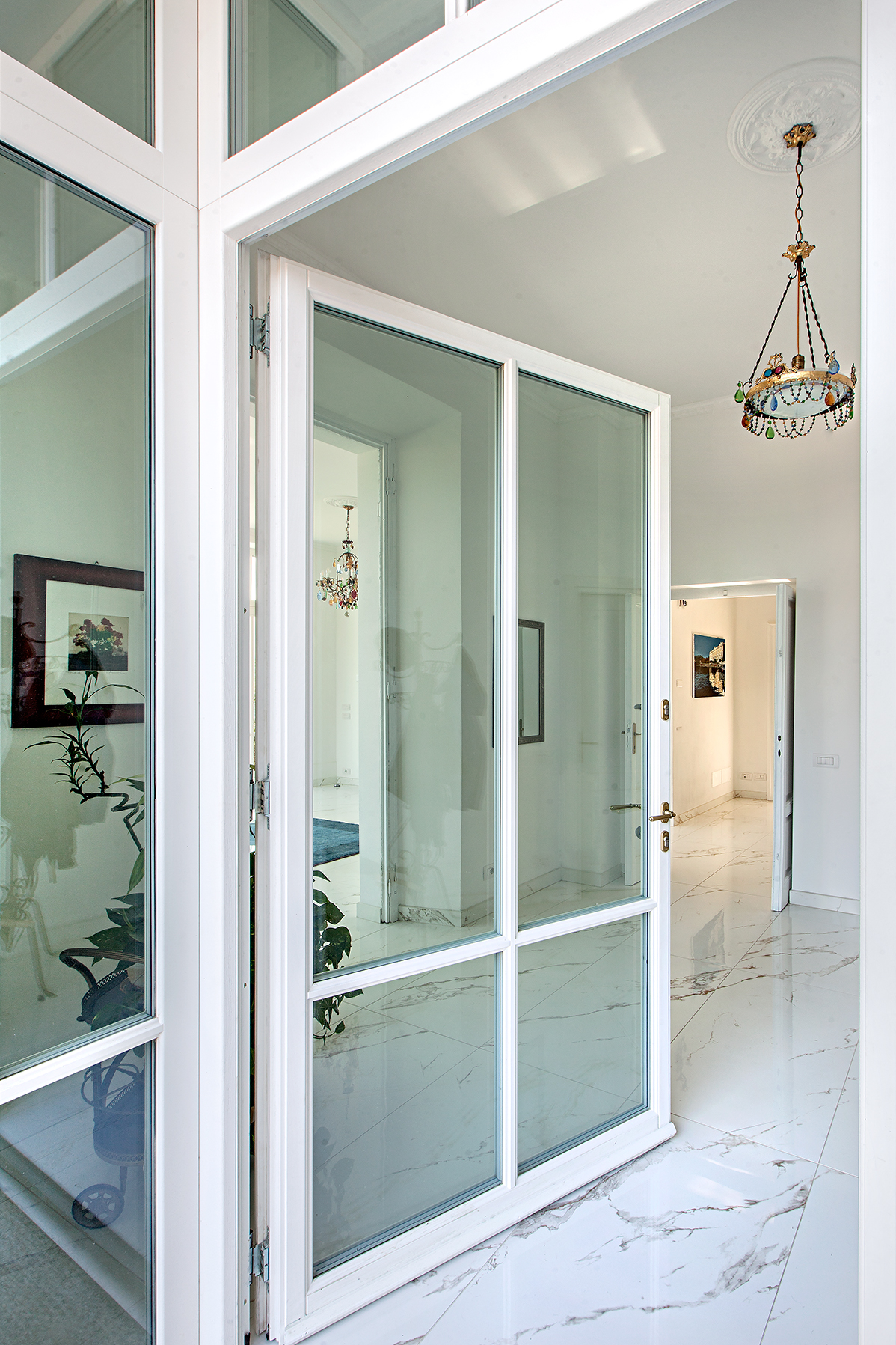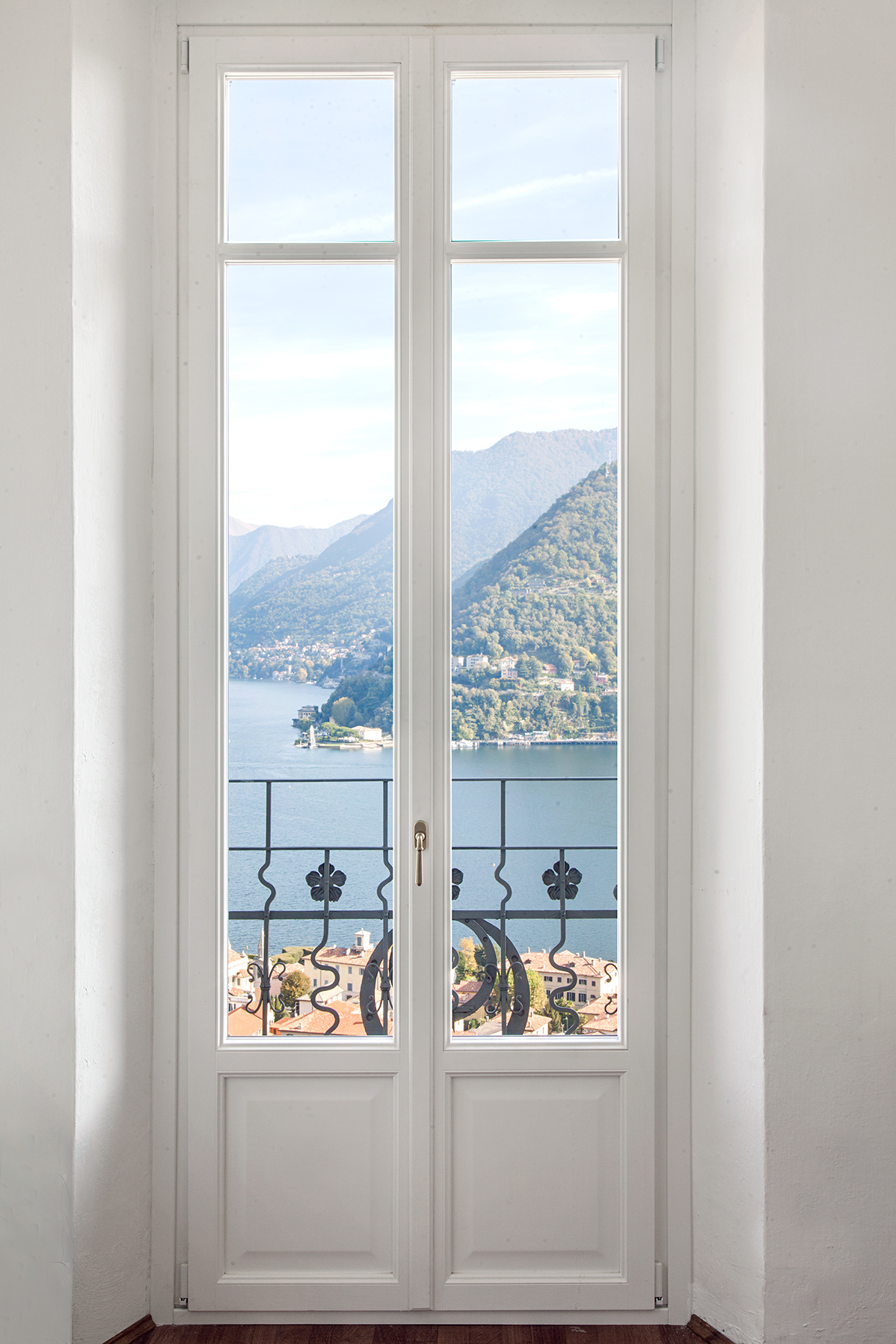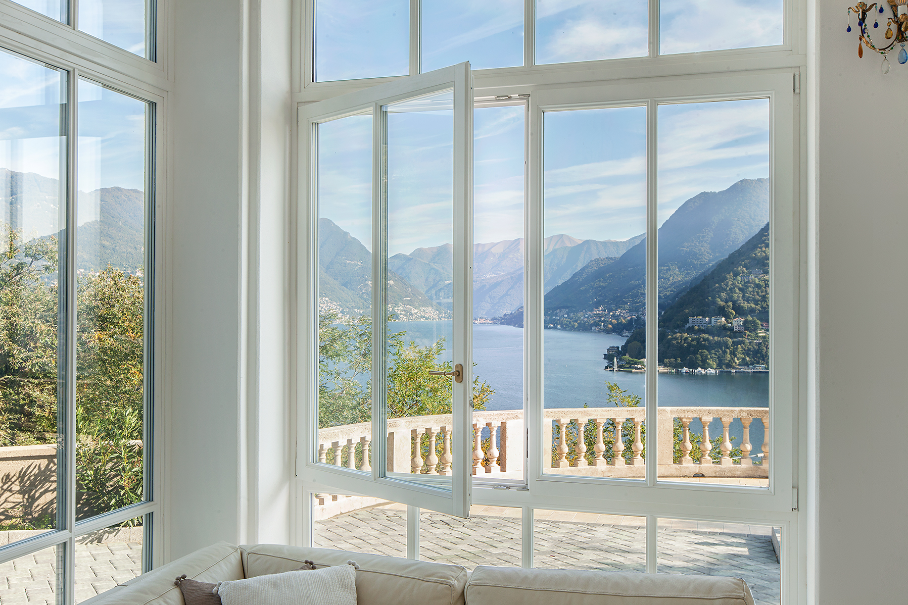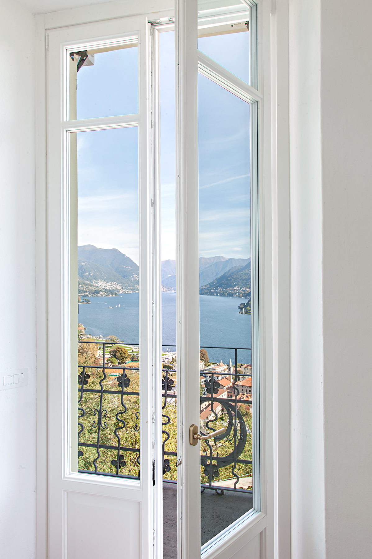 L’intervento ha previsto la sostituzione completa dei serramenti originali con finestre e porte-finestre in legno laccato bianco, caratterizzate da profili con inglesine che richiamano fedelmente lo stile della villa ottocentesca. Nel salone principale, ampie vetrate su tre lati incorniciano la vista mozzafiato sul lago e sulle montagne circostanti, trasformando il panorama in un elemento protagonista degli interni.