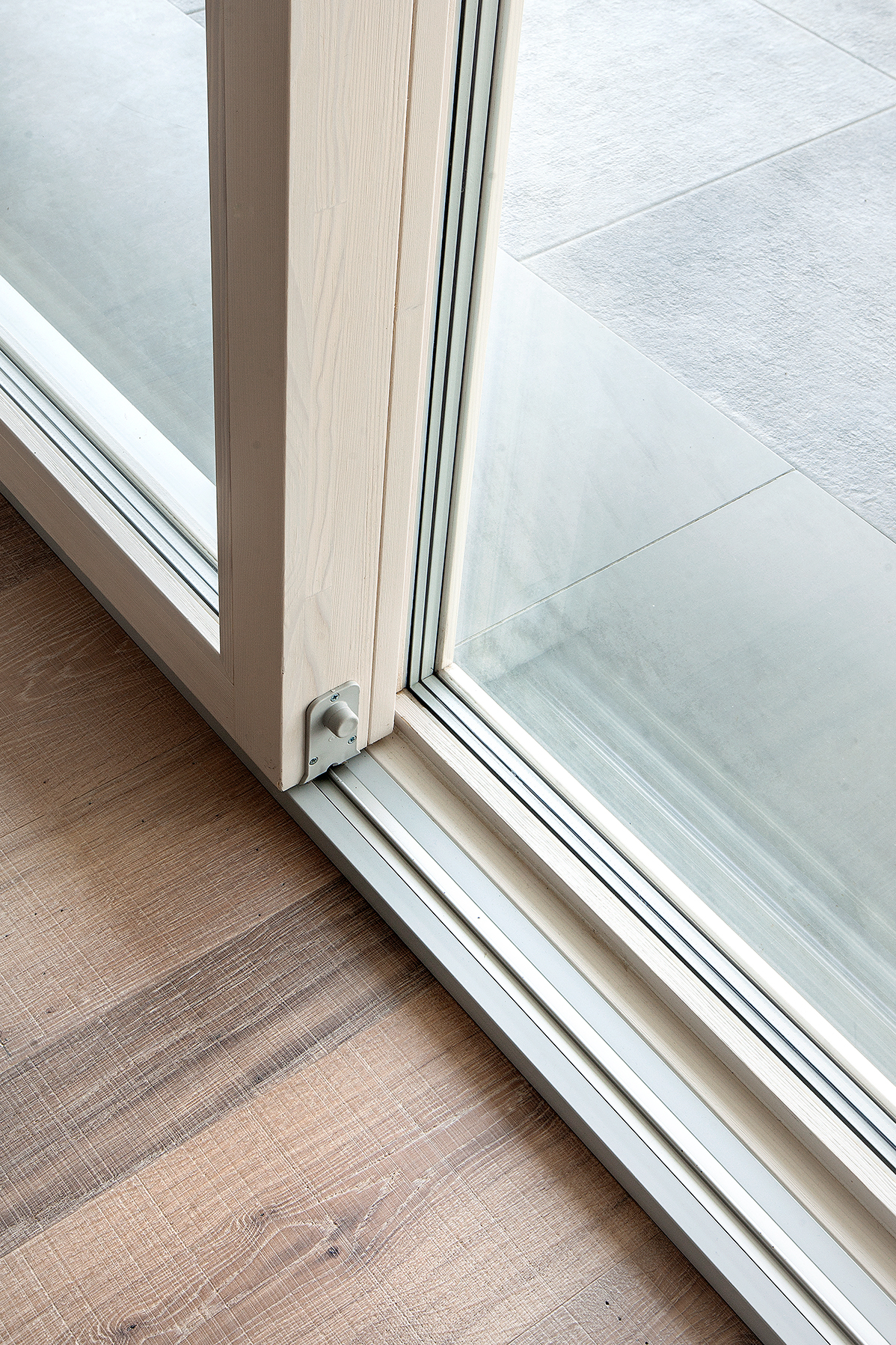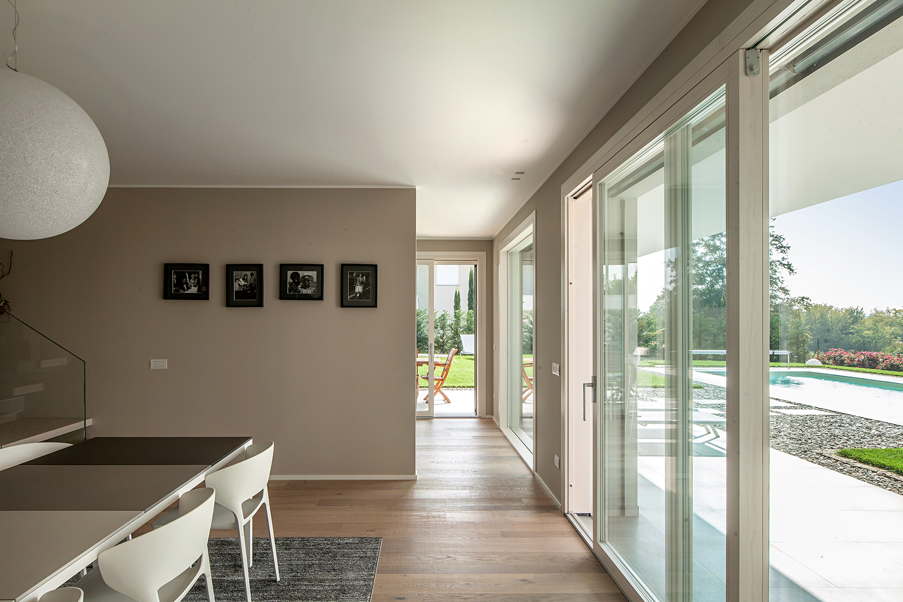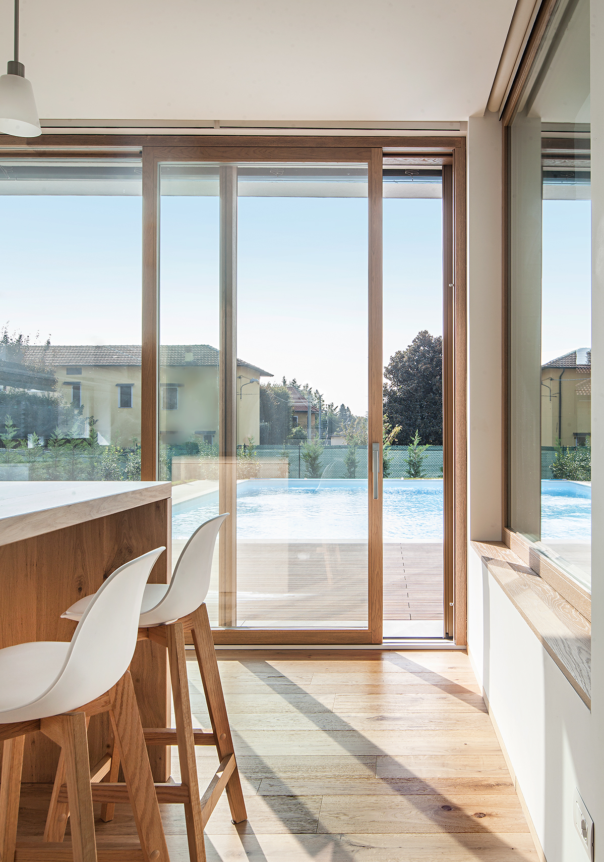 L’intervento ha previsto serramenti in legno-alluminio con interno in rovere naturale per le zone living e cucina, dove ampie porte-finestre scorrevoli collegano gli spazi abitativi alla terrazza e all’area piscina. Il giardino diventa così un’estensione naturale della zona giorno, con una continuità visiva tra interno ed esterno.