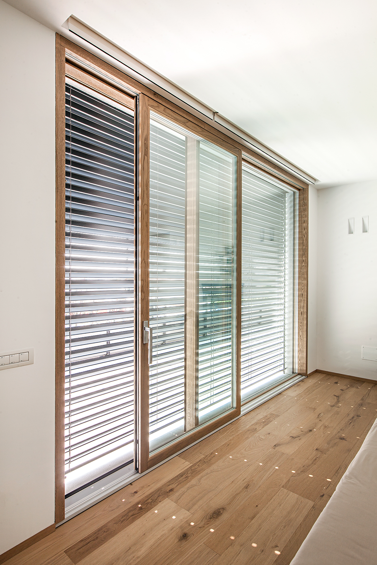Particolare attenzione è stata dedicata al controllo solare con sistemi frangisole orientabili in alluminio antracite, integrati nelle facciate per regolare luminosità e temperatura interna. Elementi di design come la finestra angolare nella zona bagno e le finestre a nastro nelle camere conferiscono personalità architettonica agli ambienti, garantendo privacy senza rinunciare alla luce naturale.